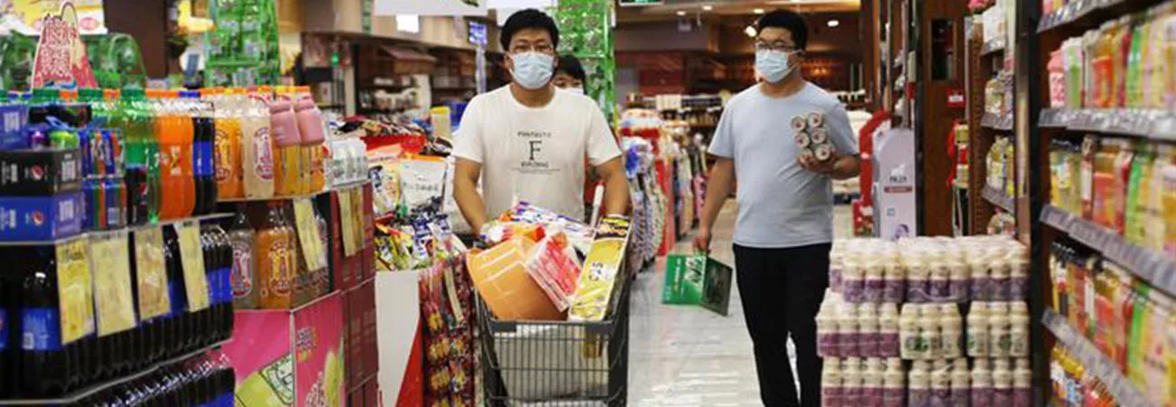 چین کے شمال مغربی صوبہ گانسو میں ڈنگشی کی ایک سپر مارکیٹ میں لوگ دکان سے خریداری کر رہے ہیں۔(شِنہوا)