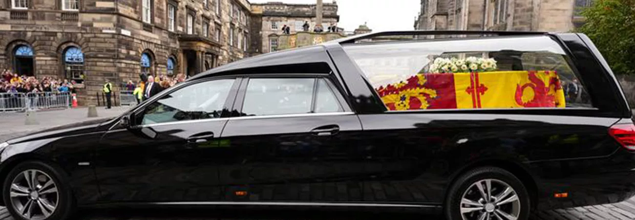 برطانیہ میں بالمورل محل سے ملکہ الزبتھ دوم کے تابوت کو لیکر آنیوالی گاڑی کے ایڈنبرگ پہنچنے کا منظر۔(شِنہوا)
