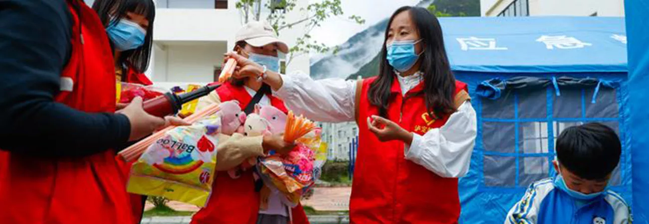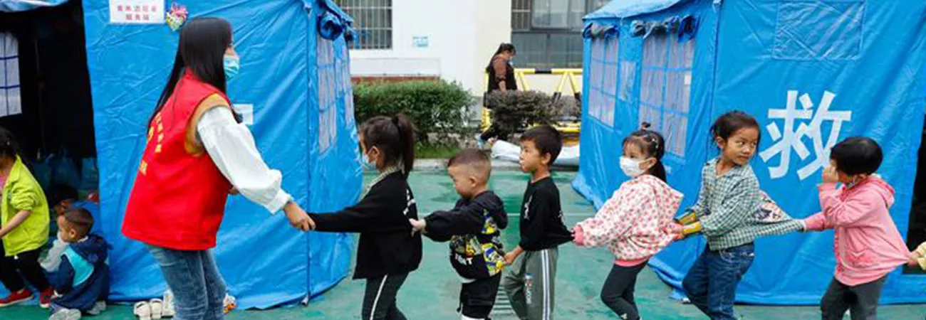 چین کے جنوب مغربی صوبہ سیچھوان کی لوڈنگ کاؤنٹی کے لوڈنگ نمبر 2 ہائی اسکول میں قائم زلزلہ متاثرین کی پناہ گاہ میں لیاؤ لیان اور دیگر رضاکار بچوں کے ساتھ کھیل رہے ہیں۔ (شِنہوا)