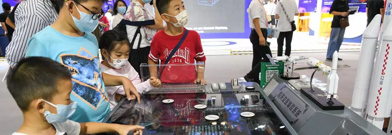 چین کے دارالحکومت بیجنگ کے شوگوانگ پارک میں منعقدہ 2022 چائنہ بین الاقوامی میلہ برائے تجارتی خدمات  میں بچے بڑی اسکرین دیکھ رہے ہیں۔ (شِنہوا)