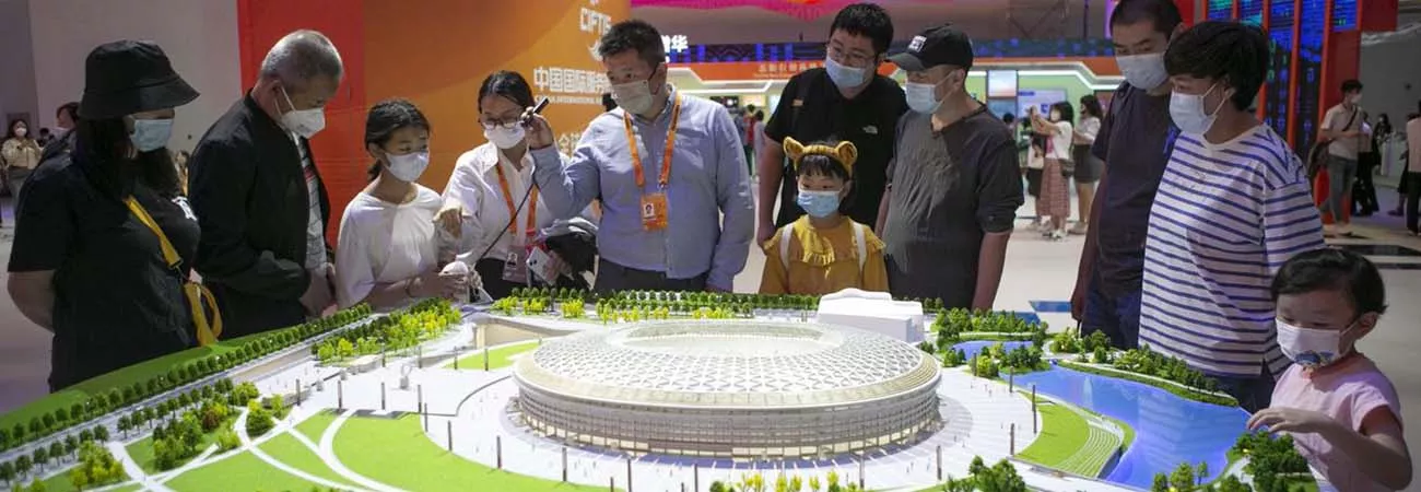 چین کے دارالحکومت بیجنگ کے قومی کنونشن سینٹر میں منعقدہ 2022 چائنہ بین الاقوامی میلہ برائے تجارتی خدمات  میں لوگ ایک ماڈل کو دیکھ رہے ہیں۔ (شِنہوا)