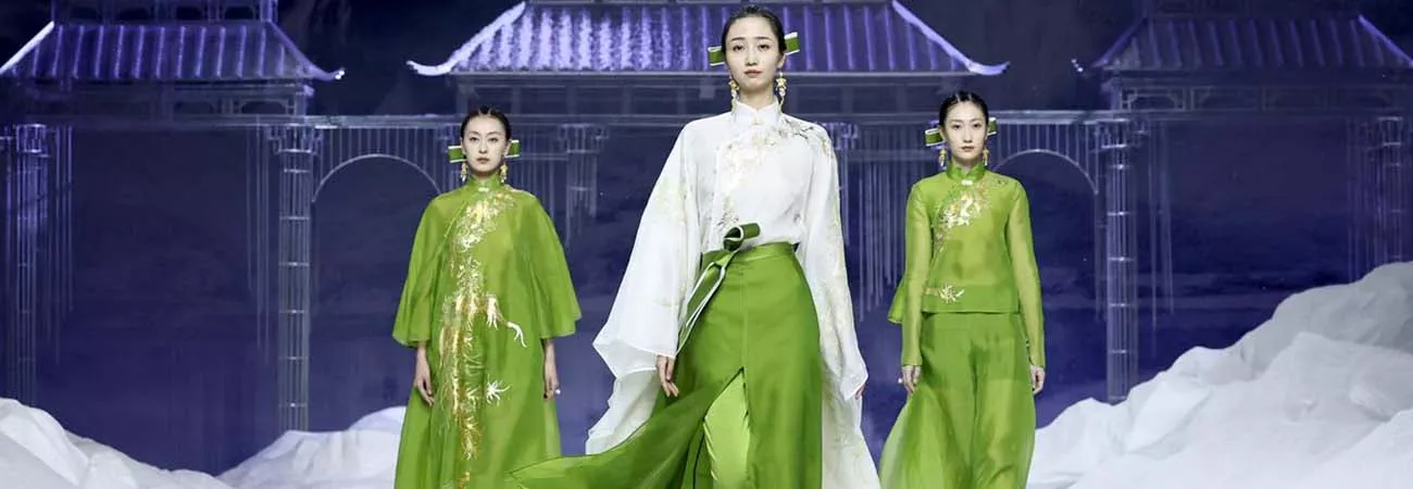 چین کے دارالحکومت بیجنگ میں منعقدہ چائنہ فیشن ویک ایس/ ایس 2023 میں ماڈلز، ڈیزائنر شیاؤنگ ینگ کے تیار کردہ ملبوسات کی نمائش کررہی ہیں۔ (شِنہوا)