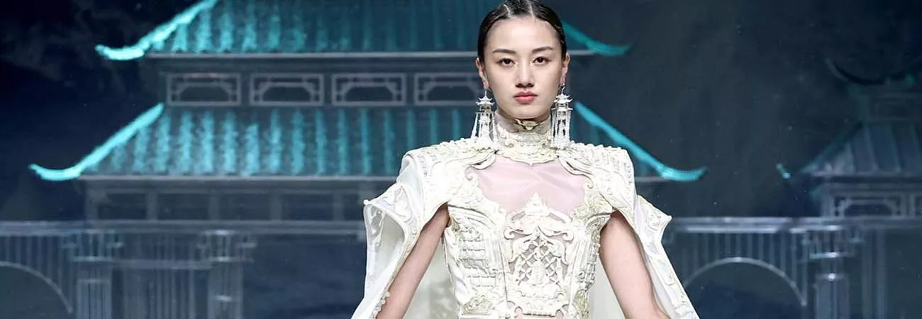 چین کے دارالحکومت بیجنگ میں منعقدہ چائنہ فیشن ویک ایس/ ایس 2023 میں ایک ماڈل ڈیزائنر شیاؤنگ ینگ کے تیار کردہ ملبوسات کی نمائش کررہی ہے۔ (شِنہوا)