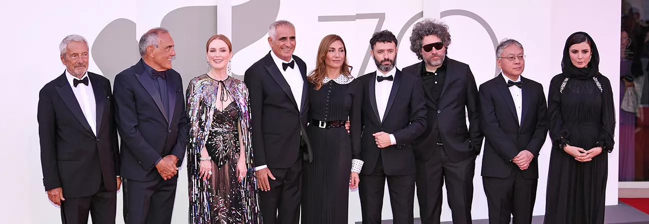 اٹلی کے شہر وینس میں ہونے والے 79 ویں وینس بین الاقوامی فلم میلے کے اہم مقابلے کے بین الاقوامی جیوری اراکین کا سرخ کارپٹ پر ایک انداز ۔ (شِنہوا)