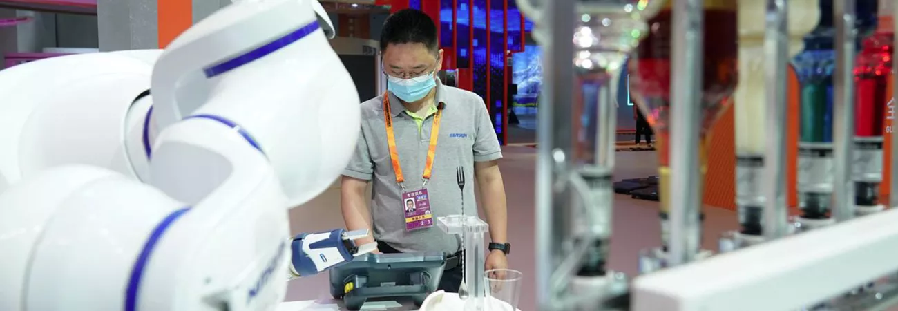 چین کے دارالحکومت بیجنگ کے چائنہ نیشنل کنونشن سینٹر میں چین بین الاقوامی میلہ برائے تجارتی خدمات 2022 کے میڈیا ریوو میں ایک نمائش کنندہ روبوٹ کی جانچ کررہا ہے۔ (شِنہوا)