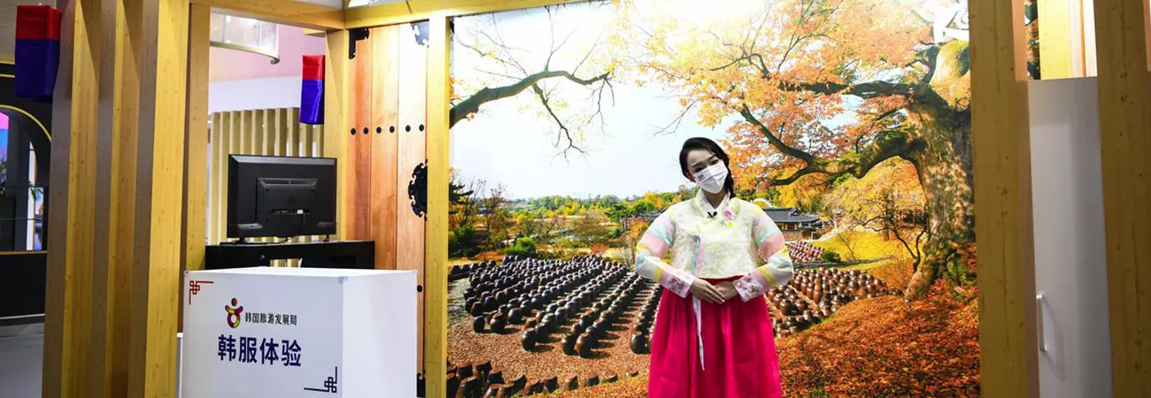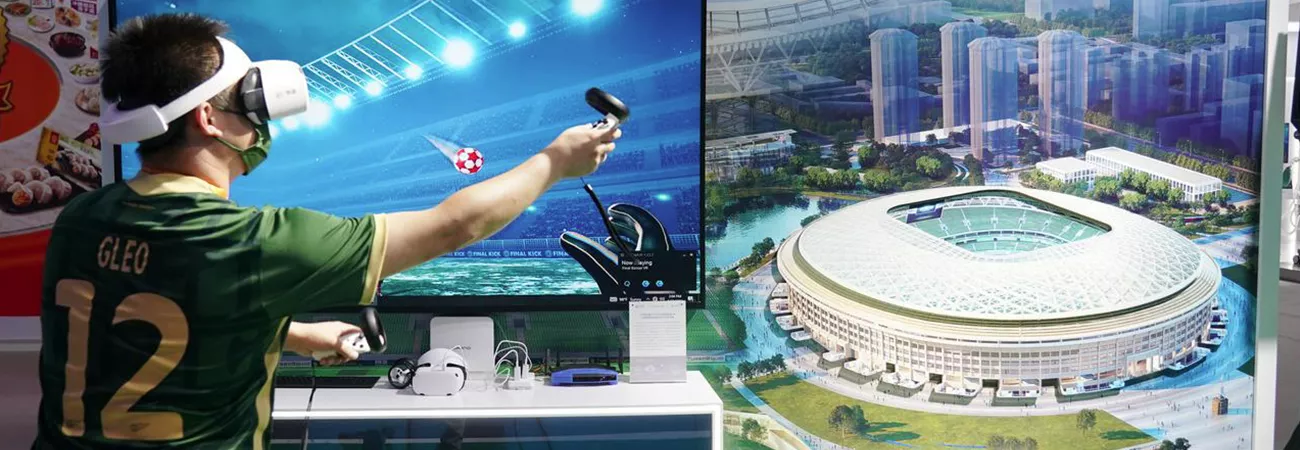 چین کے دارالحکومت بیجنگ کے چائنہ نیشنل کنونشن سینٹر میں چین بین الاقوامی میلہ برائے تجارتی خدمات 2022 میں میڈیا ریوو کے دوران عملہ کا ایک رکن جی ٹی ورس کی نمائش کررہا ہے۔ (شِنہوا)