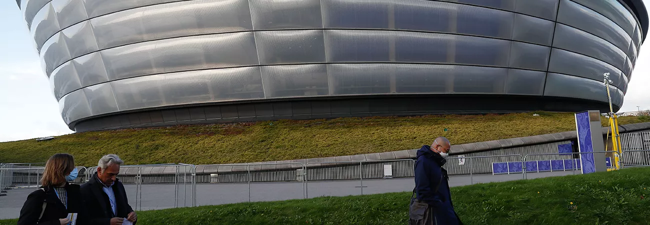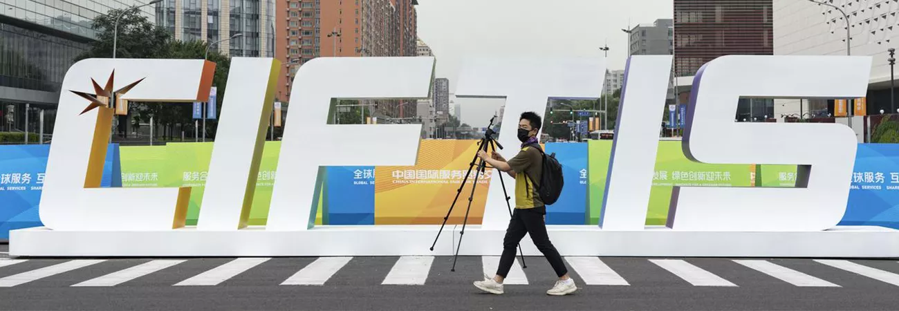 چین کے دارالحکومت بیجنگ کے چائنہ نیشنل کنونشن سینٹر میں چین بین الاقوامی میلہ برائے تجارتی خدمات 2022 کے نشان کے قریب سے ایک صحافی گزررہا ہے۔ (شِنہوا)