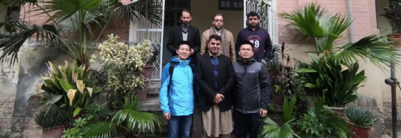 ہوآنگ ژونگ ویی (سامنے والی قطار میں دائیں سےپہلے) اور ان کی ٹیم کے رکن کا پشاور یونیورسٹی کے شعبہ فزکس کے اساتذہ اور طلباء کے ساتھ گروپ فوٹو۔(شِنہوا)