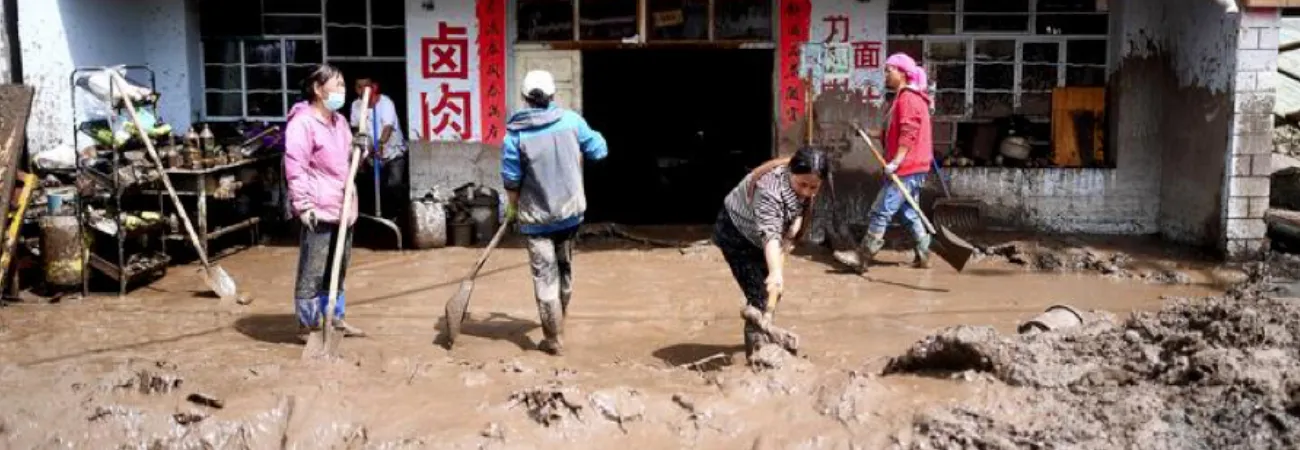 چین کے شمال مغربی صوبہ چھنگ ہائی کی خوداختیار کاؤنٹی دا ٹونگ ہو ئی اور تھو کے قصبے چھنگ شان میں مقامی افراد اپنے گھر کے پاس سے کیچڑ ہٹارہے ہیں۔ (شِںہوا)