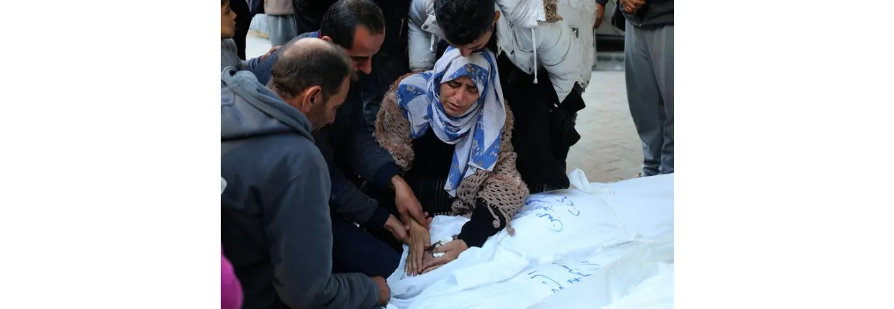 غزہ کی پٹی کے جنوبی شہر رفح میں اسرائیلی فضائی حملے میں جاں بحق ہونے والے ایک شخص کی میت کے پاس اس کے لواحقین روتے ہوئے۔(شِنہوا)