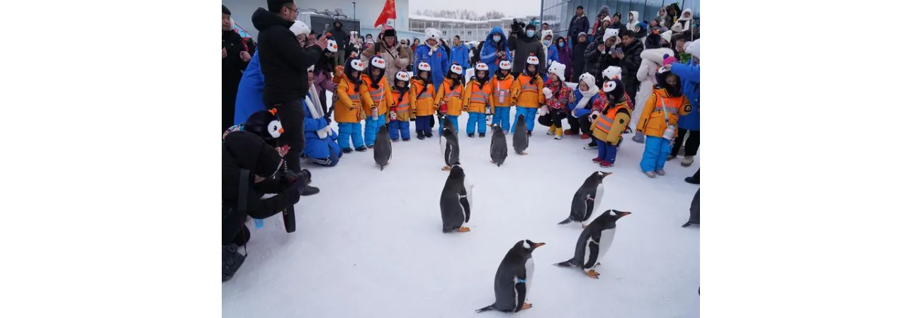چین کے شمال مشرقی صوبے حئی لونگ جیانگ کے شہر ہاربن کے ہاربن پولر پارک کے دورے میں جنوبی گوانگ شی ژوآنگ خود مختارعلاقے کے بچے پینگوئنز دیکھ رہے ہیں۔ (شِنہوا)
