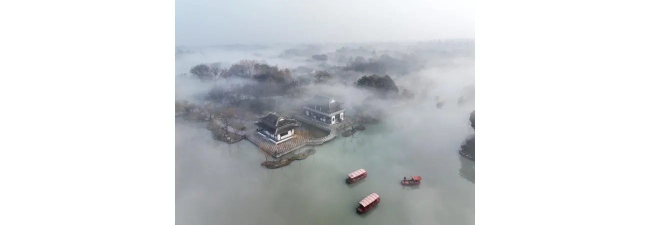 چین کے مشرقی صوبے جیانگ سو کے شہر ہانگ ژو میں دھند میں ڈوبی سلیڈر ویسٹ لیک کا ایک دلکش نظارہ۔ (شِنہوا)
